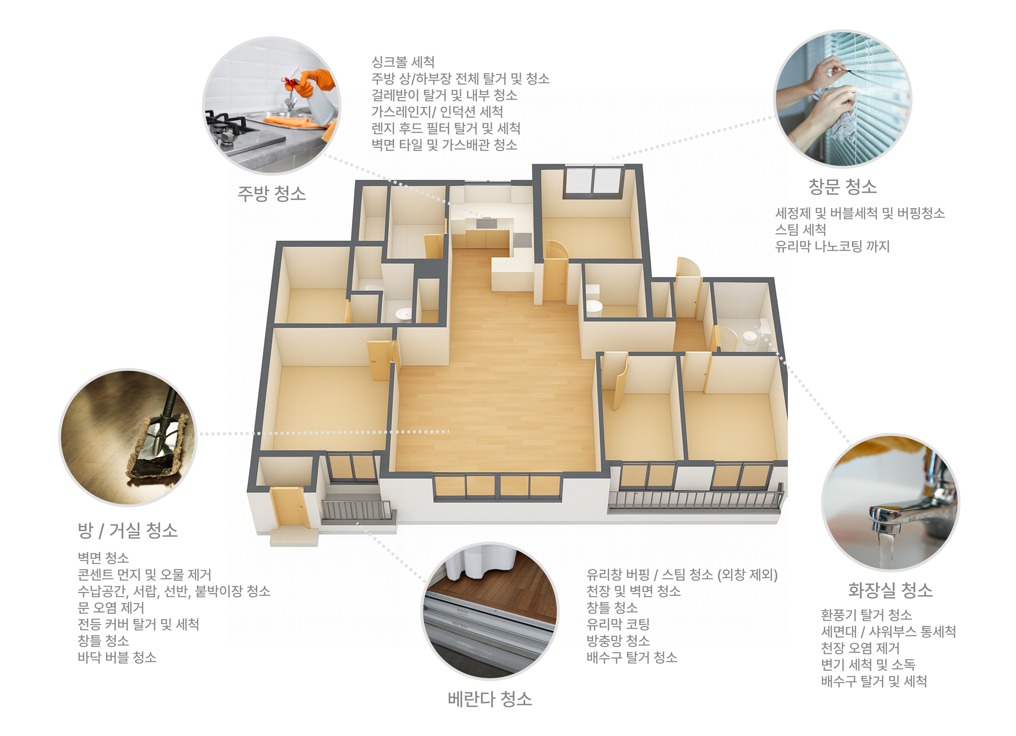 현재 거주 중인 공간을 더욱 청결하고 쾌적하게 유지하세요. 주기적 또는 단기적인 청소가 가능하며, 생활 먼지, 곰팡이, 찌든 때 등을 효과적으로 제거합니다. 바쁜 일상 속에서 깨끗한 집을 유지하고 싶은 분들께 추천드립니다.